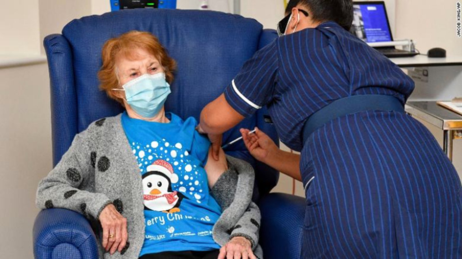 The first recipient was Margaret Keenan, who turns 91 next week. The former jewelry shop assistant received the shot at University Hospital Coventry at 6:31 a.m. while wearing a surgical mask and a blue Merry Christmas T-shirt decorated with a cartoon penguin wearing a Santa hat and red scarf.