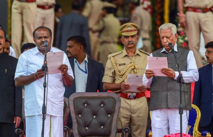 Hindustan Surkhiyan Desk:HD Kumaraswamy was on Wednesday sworn in as the Karnataka chief minister, who will head the JDS-Congress coalition government. He was administered the oath of office and secrecy by Governor Vajubhai Vala at a grand ceremony in the Vidhana Soudha complex. State Congress chief and prominent Dalit leader G Parameshwara took oath as the deputy chief minister.